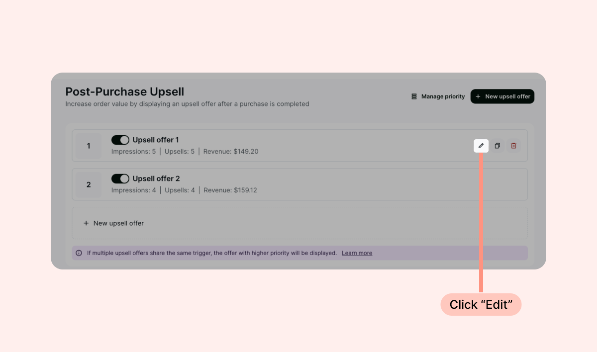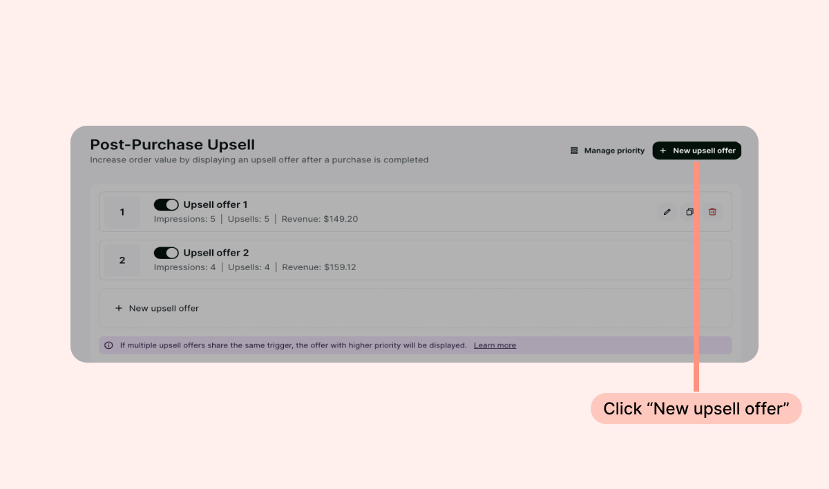 Once you have created multiple upsell offers on your account, you can adjust their priority. In the case where multiple upsell offers are triggered by the same product, the offer given to your customers will be triggered based on the priority set in your account.