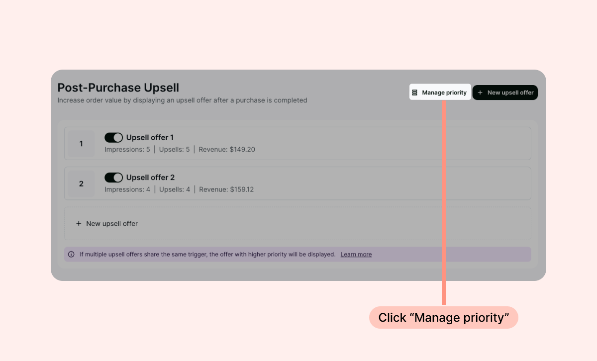 • Drag and drop your upsell offers to set your preferred priority, and click "Save priority":