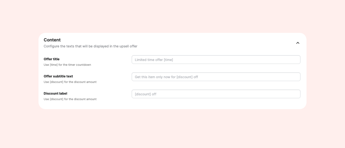 • Offer subtitle text: Adjust the text under the timer banner’s title (appears only if a discount is set). You can insert your discount amount with a [discount] placeholder.