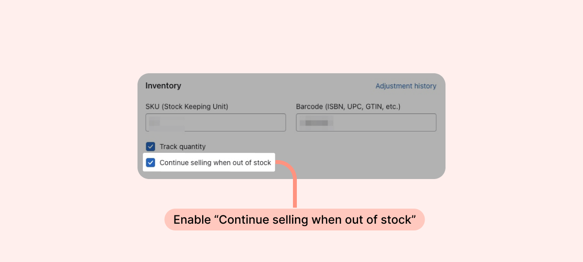 • If the selected product runs out of stock, the upsell page will not appear during your customers' checkout. To override this, enable the "Continue selling when out of stock" setting on your product’s Shopify settings page: