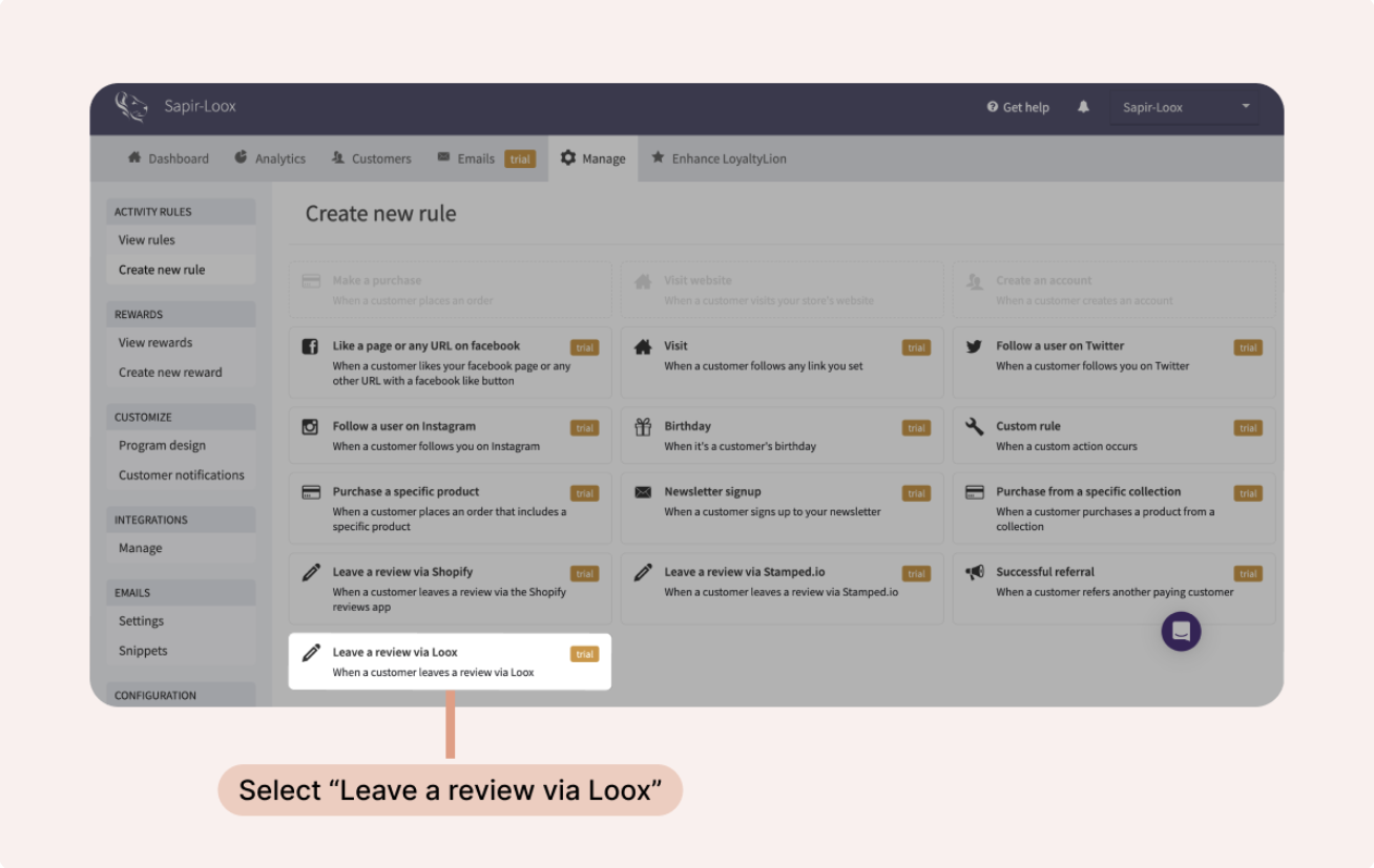 - Inside the Loox app's "Settings - Integrations" menu, go to "Loyalty Lion" and click "Manage".