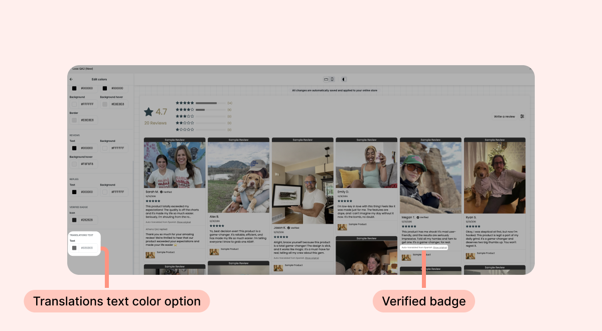 - Once enabled, translated reviews will have a label indicating the customer's original review language. This label can be customized in the Product Reviews Widget editor.
