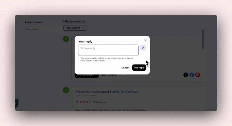 3. Click the AI icon inside the reply box. Loox will automatically write a personalized reply based on the review’s content.