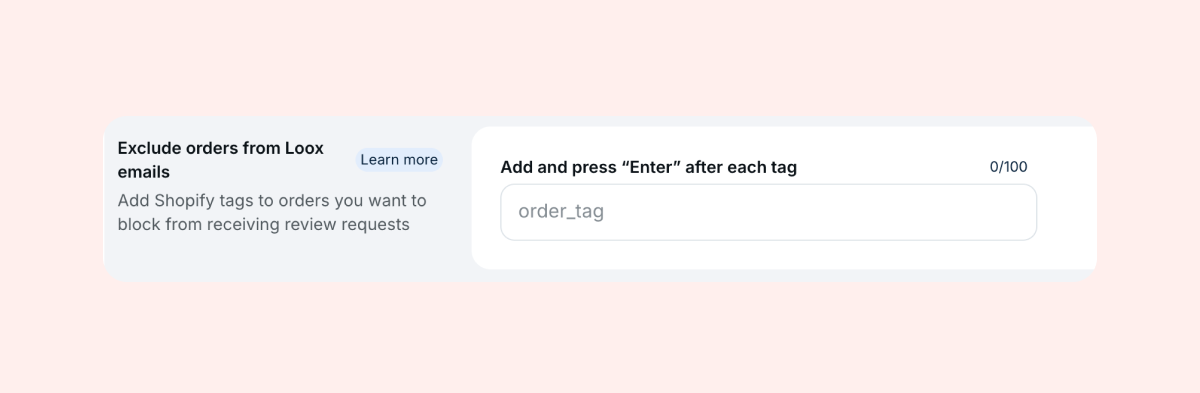 Q: Can I block-list multiple tags at once? A: Yes. In the Exclude orders from Loox emails field in your Loox settings, add each tag separated by a comma with no space - for example: tag1,tag2.