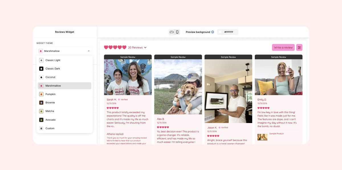 Choose a ready-made theme for your Reviews Widget to match your brand's look and feel. Each theme sets the layout, styling, and colors as a starting point you can customize.