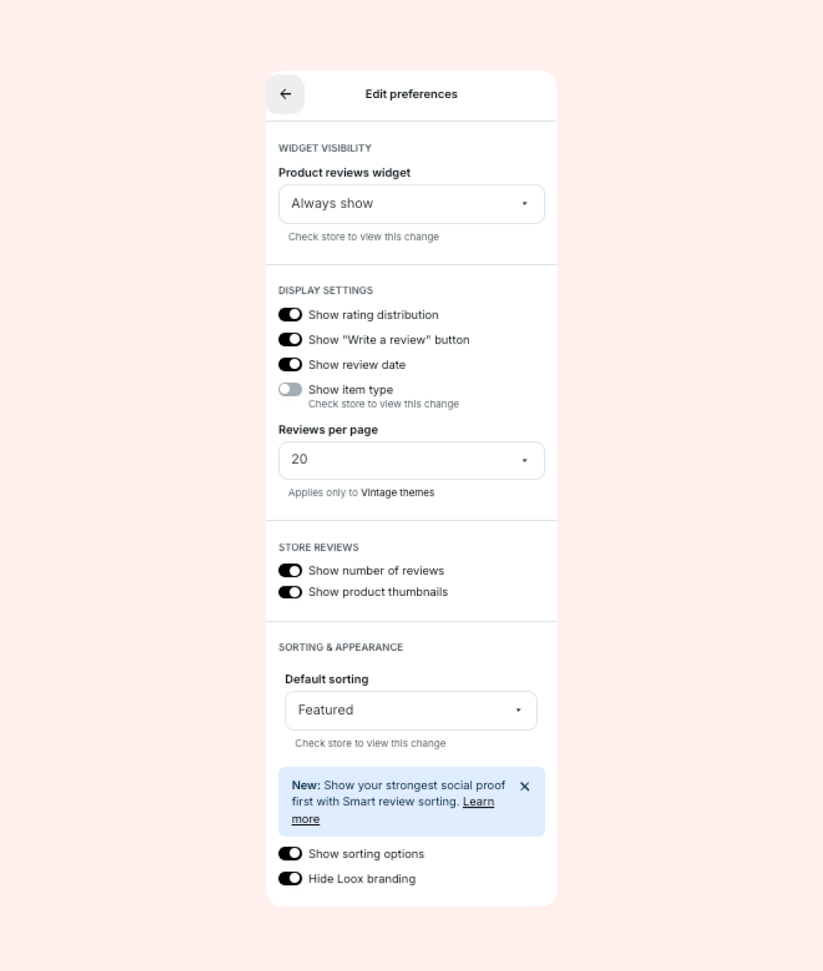 - Item type title: Adjusts the text that appears on the review card that shows the product variant the reviewer purchased.