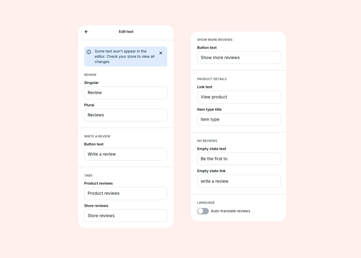 - Product page - Link text: Adjusts the text that is displayed on the review card that links to the product page attached to the review.