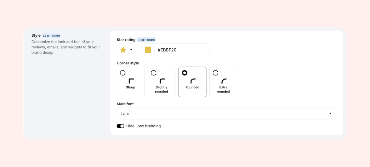 Ensure your brand consistently shines through by customizing your Loox widgets. Easily add your brand logo, customize widget corners, star icons, and fonts to match your store’s aesthetic.