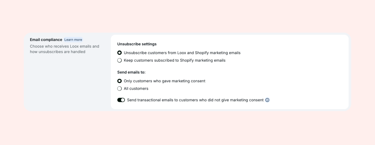- Opted-out: Customers choosing to receive marketing emails from your store will have their orders labeled as “Opted-out”. Due to data privacy regulation updates (also known as GDPR), merchants may filter who will receive Review Request emails (to allow them to follow these regulations on Loox). This can be changed inside the Loox Platform’s “General” Settings section. Under “Email compliance”.