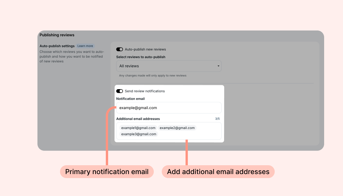 Note: Additional email addresses are only available when review notification emails are enabled. If you toggle notifications off, these addresses will not receive emails.