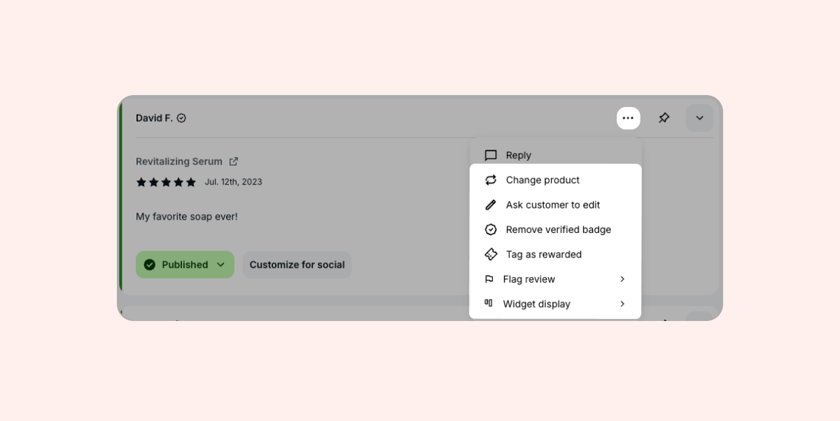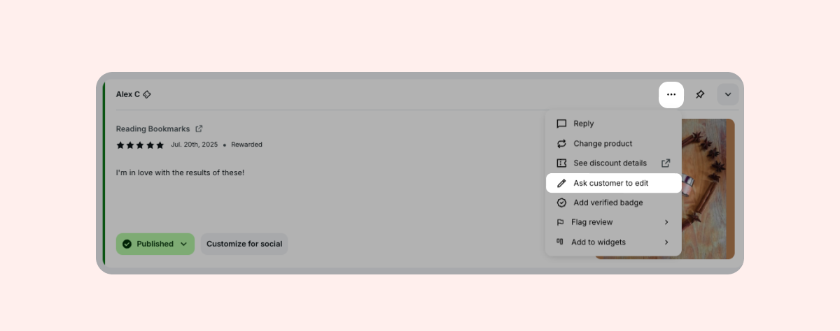 Customers can edit their review if they’ve changed their mind or you’ve resolved an issue for them. Send an invitation to update their review by clicking on the three dots (...) at the top of the review and selecting “Ask customer to edit.” Click here to learn more.
