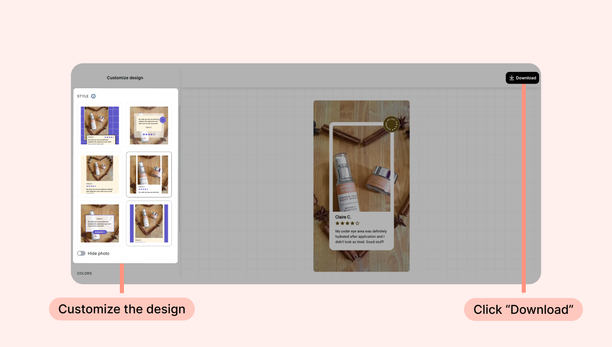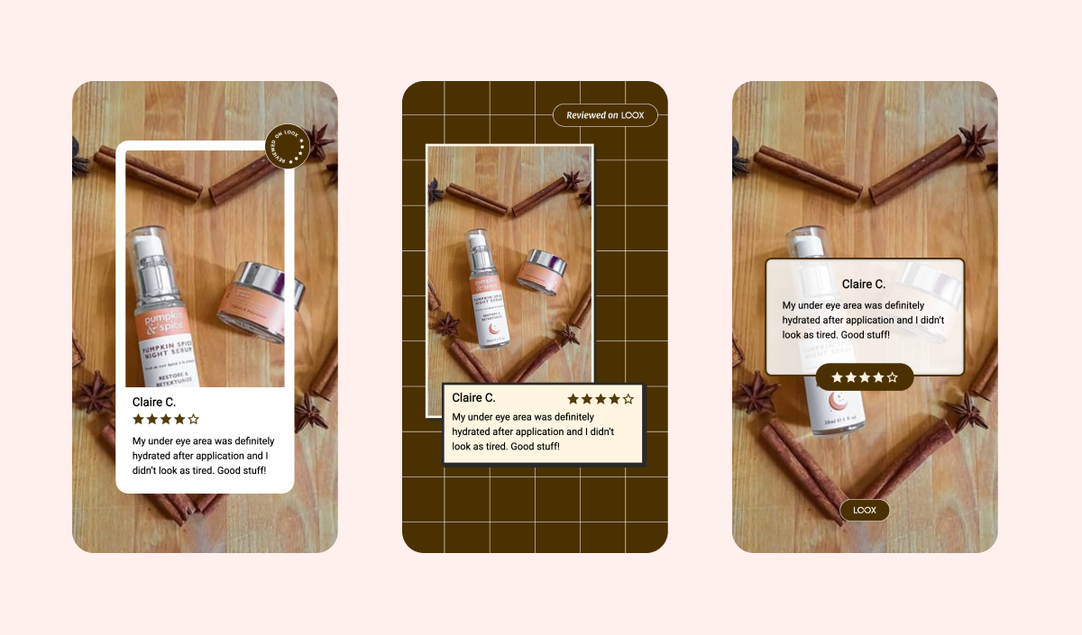 Loox Studio makes it easy to turn your best customer reviews into beautiful, ready-to-share content you can use across your marketing channels to boost trust and engagement.