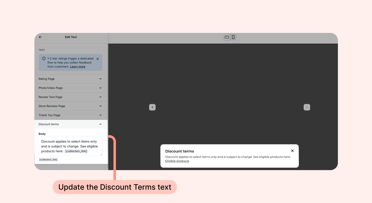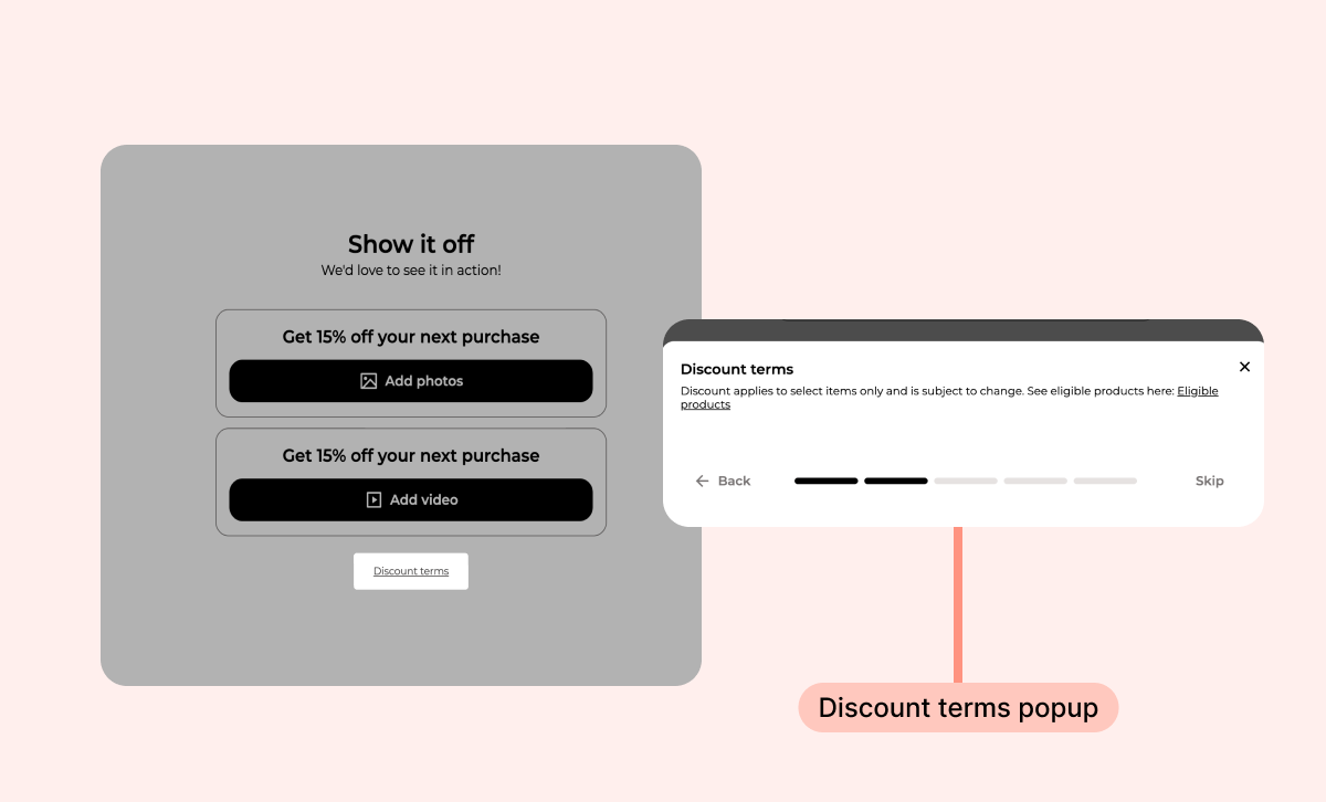 When a collection limitation is active, Loox automatically adds a discount disclaimer to key points in your customer's review journey. This keeps things transparent and sets the right expectations before customers try to redeem their code.
